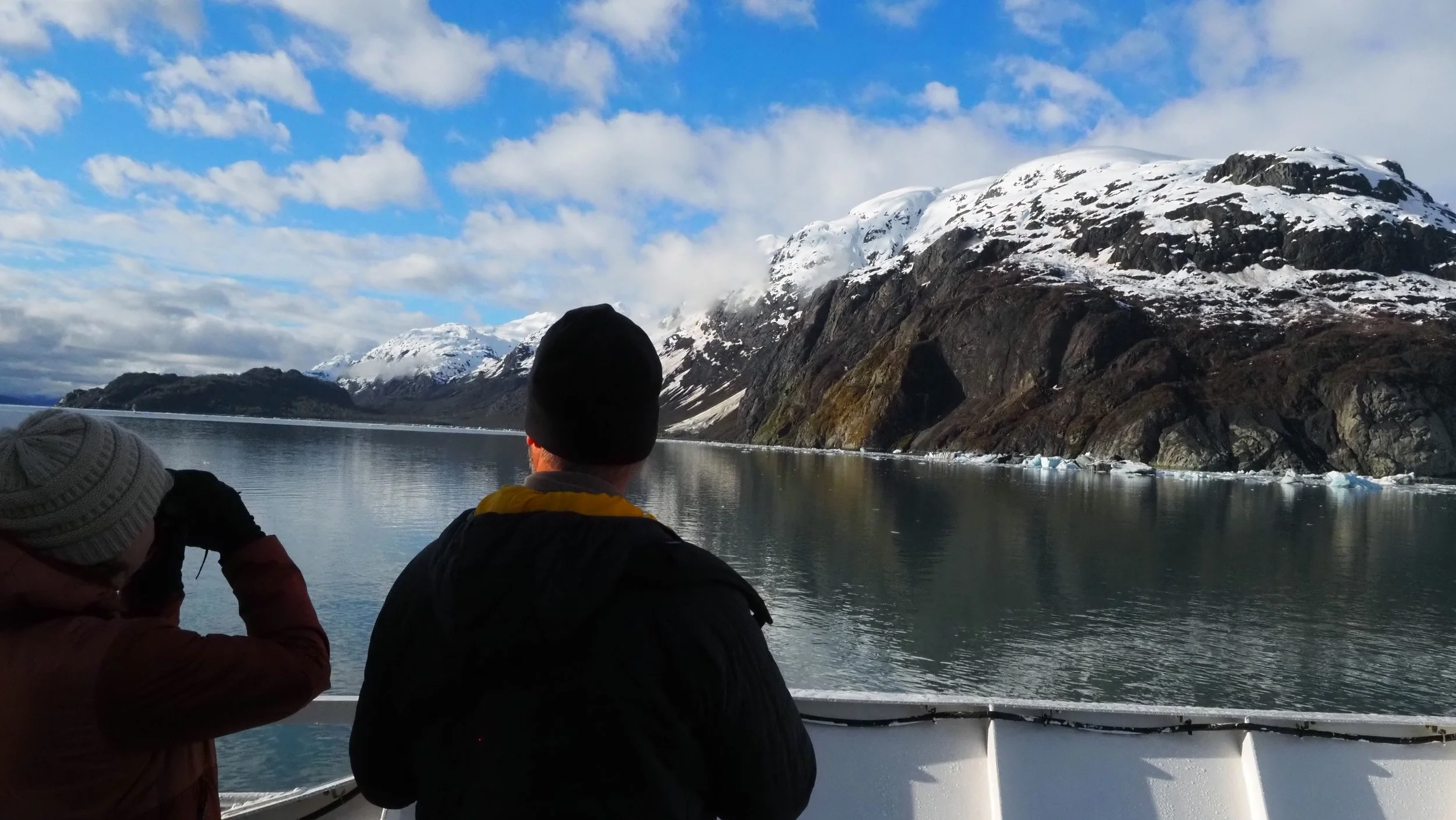 People on a boat looking at snow-covered mountains and icy water in a fjord.